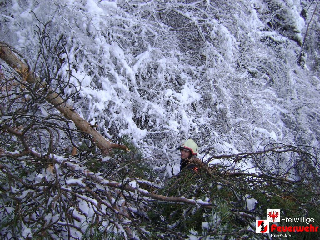 Auch in dieser Nacht blockierten wieder mehrere Bäume die gesperrte Landesstraße. Um 06:00 Uhr traff sich der Krisenstab (Gemeinde, Feuerwehr, Straßenmeisterei) und beschloss die weitere Vorgangsweise. Kurz darauf rückten 25 Mann der FF Karrösten zur Beseitigung der Schneesturmschäden aus. Als gegen 07:00 Uhr die Straße fast vollständig geräumt war, fiel ein Baum nur 50m vor den Einsatzkräften auf die 25kV Leitung der TIWAG. Bis zur Abschaltung der Leitung, mussten sich die Einsatzkräfte zurückziehen. Der brennende Baum erlosch durch den Schnee von selbst.