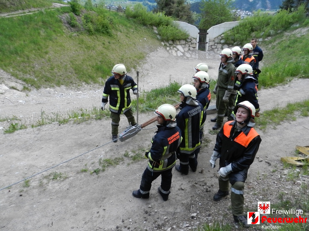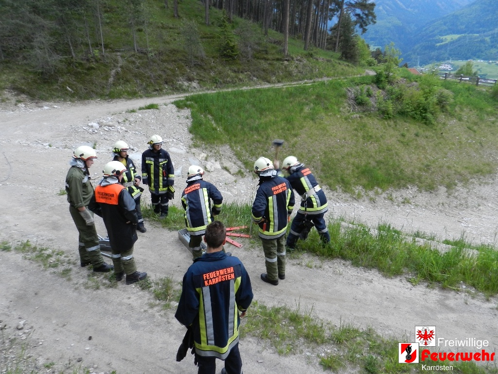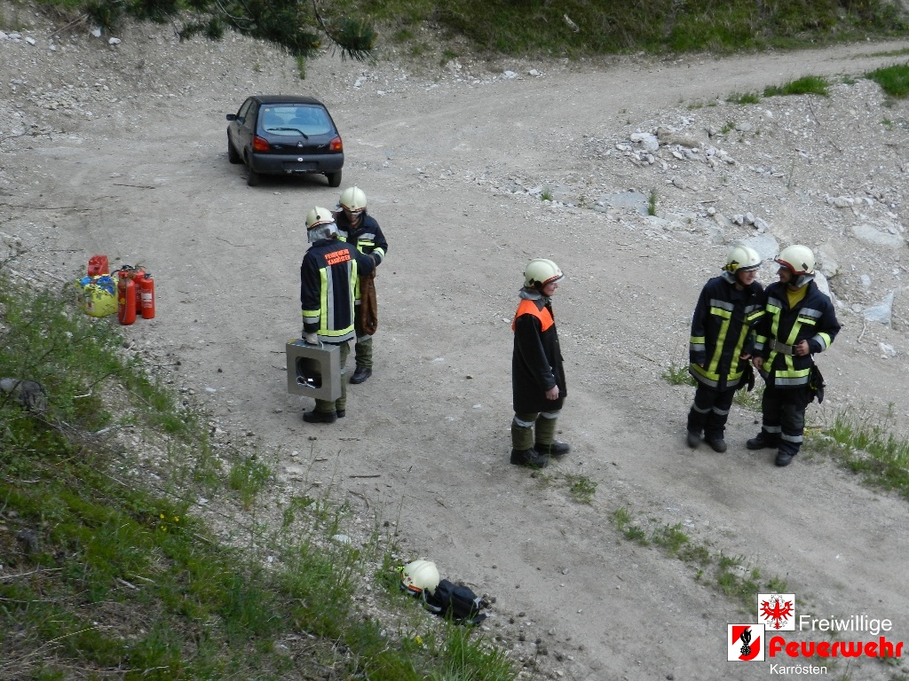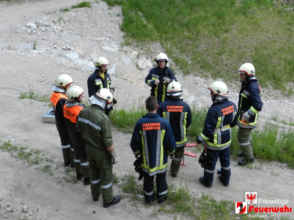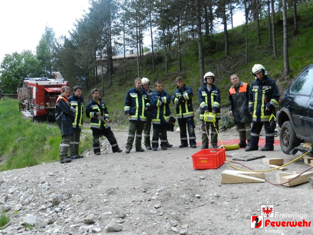 Bei ihrer Gruppenprobe beschäftigten sich die Kameraden mit dem Sichern von Fahrzeugen mittels Greifzug und Freilandverankerung, dem Anheben mittels Hebekissen und dem Löschen eines PKW-Brandes mit Feuerlöscher und Mittelschaum unter Atemschutz.